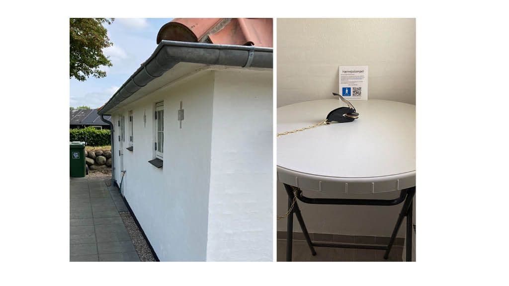 Find stemplet: Stemplet findes ved Skivum Kirke, på et bord i toiletbygningen, som findes inden for diget.
