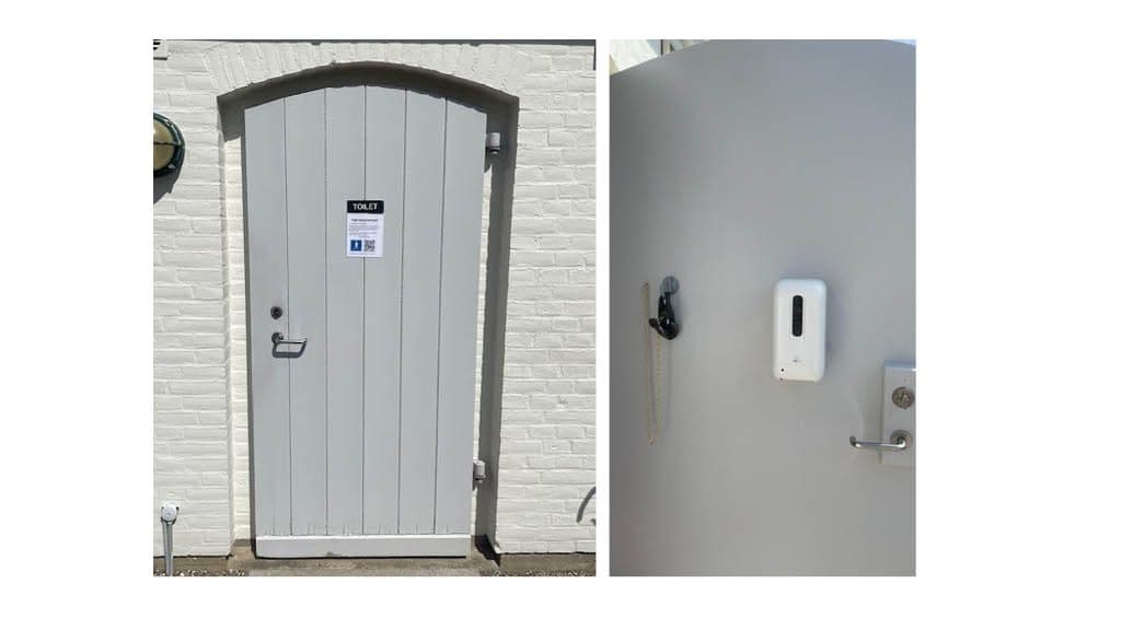 Find stemplet: Stemplet hænger på indersiden af døren til det offentlige toilet, ved siden af Rise Kirke.